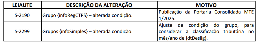 Segundo o documento, o objetivo é apresentar ajustes necessários nos leiautes do eSocial para garantir maior consistência nas validações e adequação às normas recentes, como a Portaria Consolidada MTE nº 1/2025.